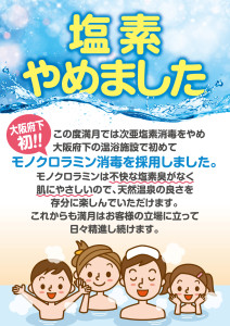 この度満月では次亜塩素消毒をやめ、大阪府下の温浴施設で初めてモノクロラミンを導入しました。不快な塩素臭もなく、肌にも優しいので天然温泉本来の良さを存分に堪能していただけます。