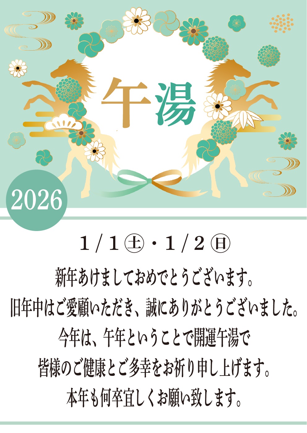 2026年の干支「午(うま)」にちなみ、開運を願う特別な湯「午湯」をご用意いたしました。 香り豊かな湯に包まれながら、皆様のご健康とご多幸を祈念いたします。 新しい一年の始まりを、心温まるひとときとともにお迎えください。