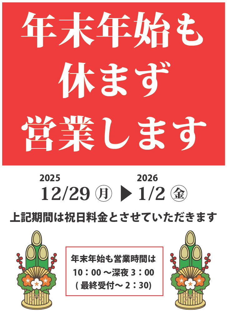 | 営業時間 | 年中無休 午前10:00〜深夜3:00(最終受付 深夜2:30) ※設備点検の為、お休みを頂く場合がございます。 |